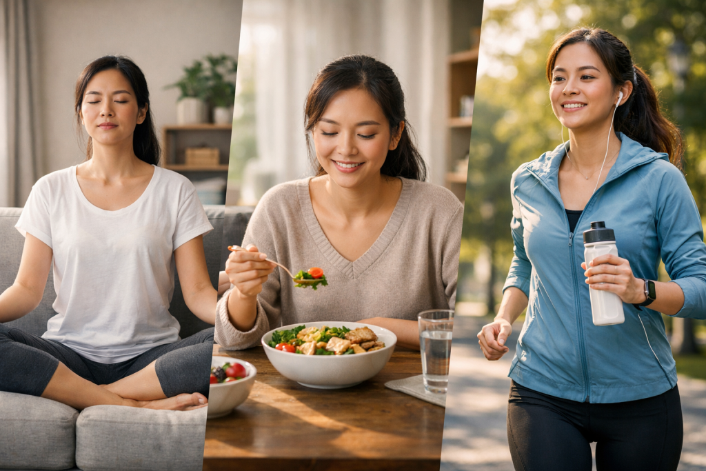 Anda tidak perlu olahraga berat setiap hari. Jalan kaki 10–20 menit, stretching 5 menit, atau naik turun tangga bisa memberi efek nyata. Kuncinya adalah konsistensi, bukan intensitas.