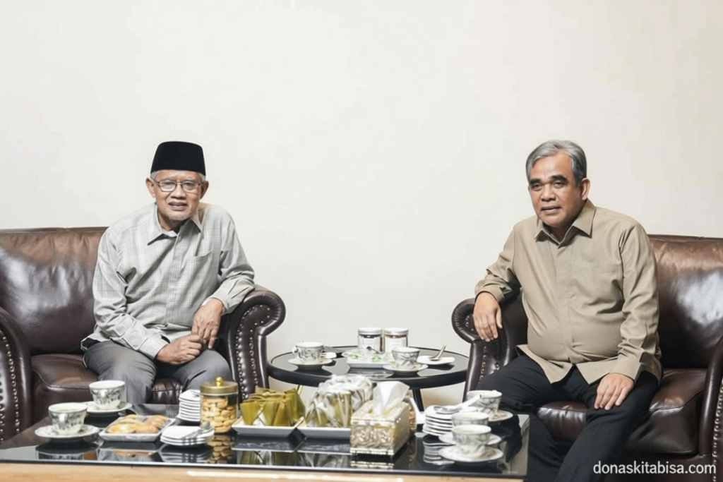 Di Yogyakarta, tepatnya di Bantul, berlangsung pertemuan antara Ketua MPR RI Ahmad Muzani dan Ketua Umum Pimpinan Pusat Muhammadiyah Haedar Nashir pada hari Minggu (5/4) malam. Muzani mengirimkan pesan salam dari Presiden Prabowo Subianto kepada para tokoh agama dan pimpinan pondok pesantren di sana. “Presiden Prabowo Subianto telah menyampaikan salam hormat kepada para tokoh agama, ulama, dan pimpinan lembaga pendidikan keagamaan yang akan kami kunjungi, termasuk Prof. Haedar Nashir dan Ibu Haedar,” ujar Muzani dalam pernyataannya di Jakarta, Senin.